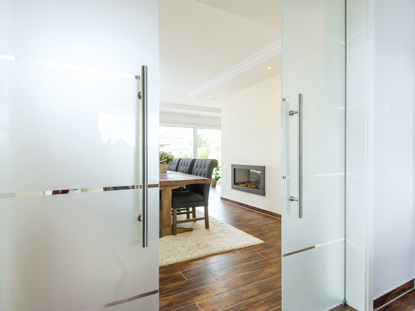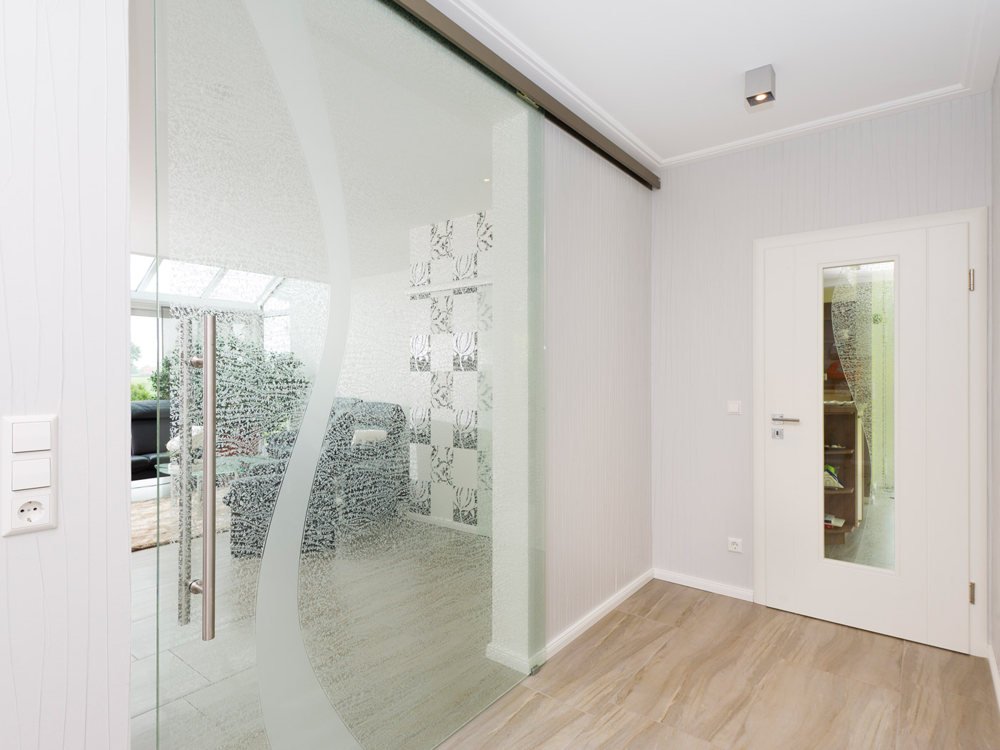 Mit Glastüren von Glashaus Dingden können Sie Ihre Türen vielseitig und individuell gestalten. Ob Glastür oder Schiebetür – gern beraten wir Sie über die Möglichkeiten. Für ein harmonisches Raumbild wählen Sie die passende Glassorte aus: Klarglas, satiniert, gefärbt oder bedruckt. Überzeugen Sie sich von den unzähligen Variationsmöglichkeiten.